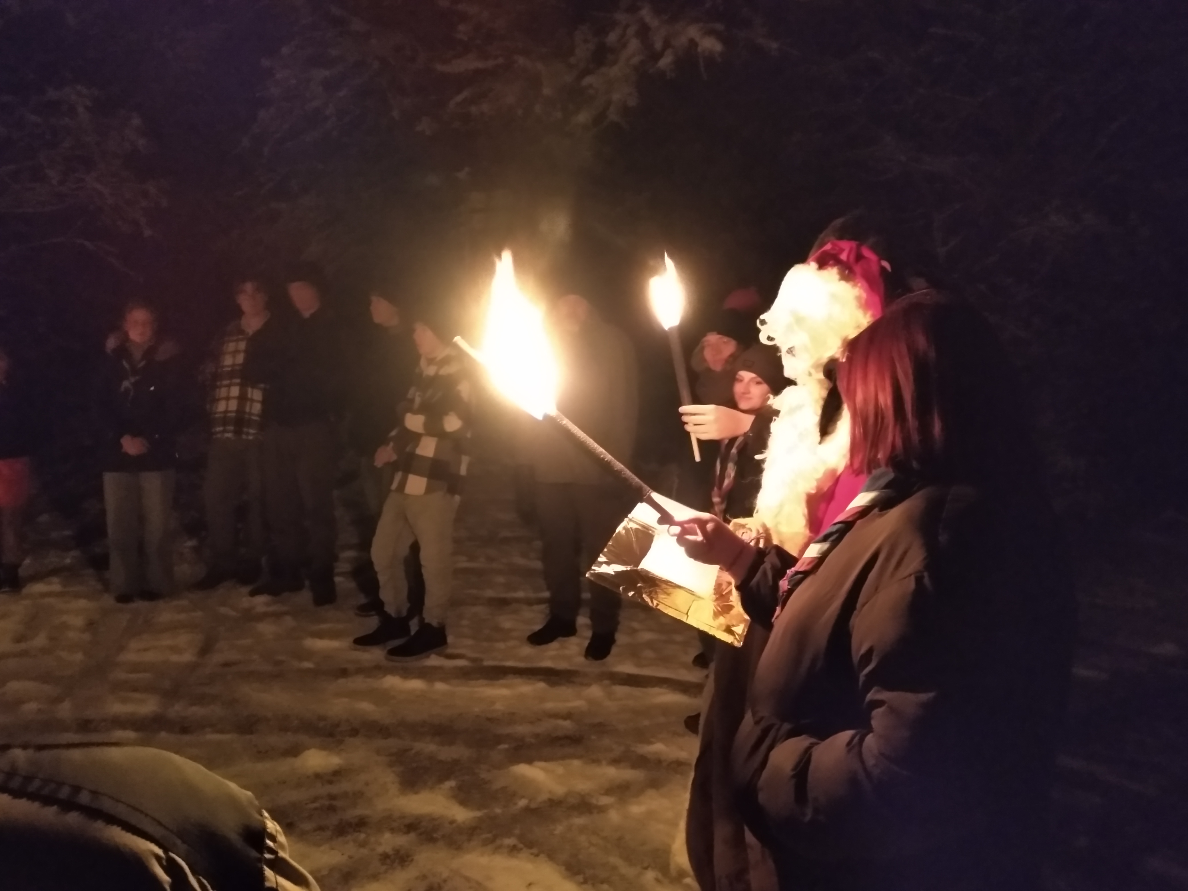 Zur Weihnachtsfeier des VCP Unterrot waren wir ans Pfadihaus eingeladen worden. Hier bot jede Sippe Selbstgemachtes an und bei einer Tasse Tschai konnte man sich unterhalten und etwas herumstöbern. Dann ging es mit den Fackeln in den Wald, wo wir auf den Weihnachtsmann trafen, der zu jeder Sippe aus dem goldenen Buch vorlas und Geschenke verteilte. Eine schöne Tradition.