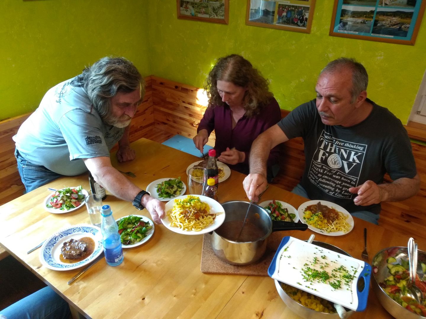 Zum gemeinsamen Kochen trafen sich einige Fördervereinsmitglieder im Pfadihaus. Schon bei der Vorbereitung wurden die benötigten Zutaten und die Zubereitung besprochen. Nun musste das Ganze nur noch in die Tat umgesetzt werden, was sehr gut gelang und ein tolles Menü auf den Tisch bracht. Vorne weg gabe es eine Griesklößchensuppe. Danach wurde genussvoll der Rinderbraten mit Spätzle, Kartoffelsalat und grünem Salat gegessen. Abschließend gab es Vanilleeis mit heißer Kirsch-Grütze. Da bekommt man gleich wieder Appetit. Ein voller Erfolg und ein schöner gemeinsamer Mittag mit leckerem Ende. Das wird nicht das letzte mal gewesen sein.