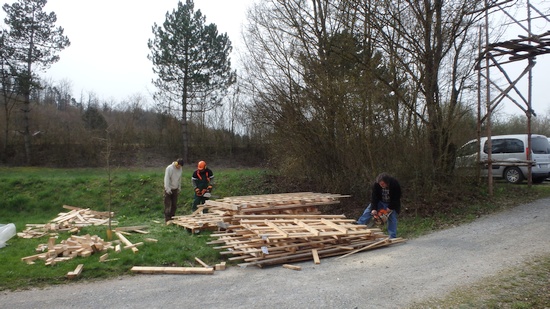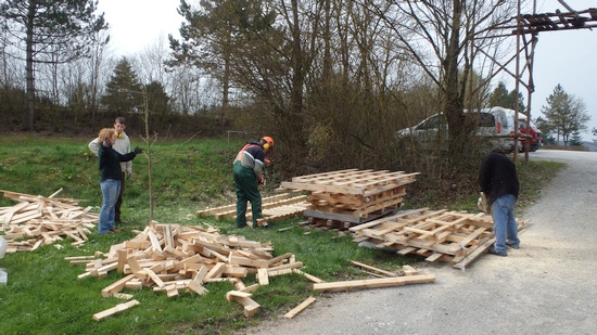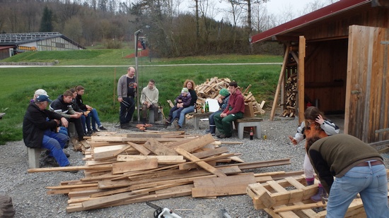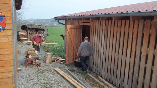 Zum Aufarbeiten des am Pfadihaus gelagerten Holzes trafen sich zahlreiche Helferinnen und Helfer am Samstag, 09.04.2016.