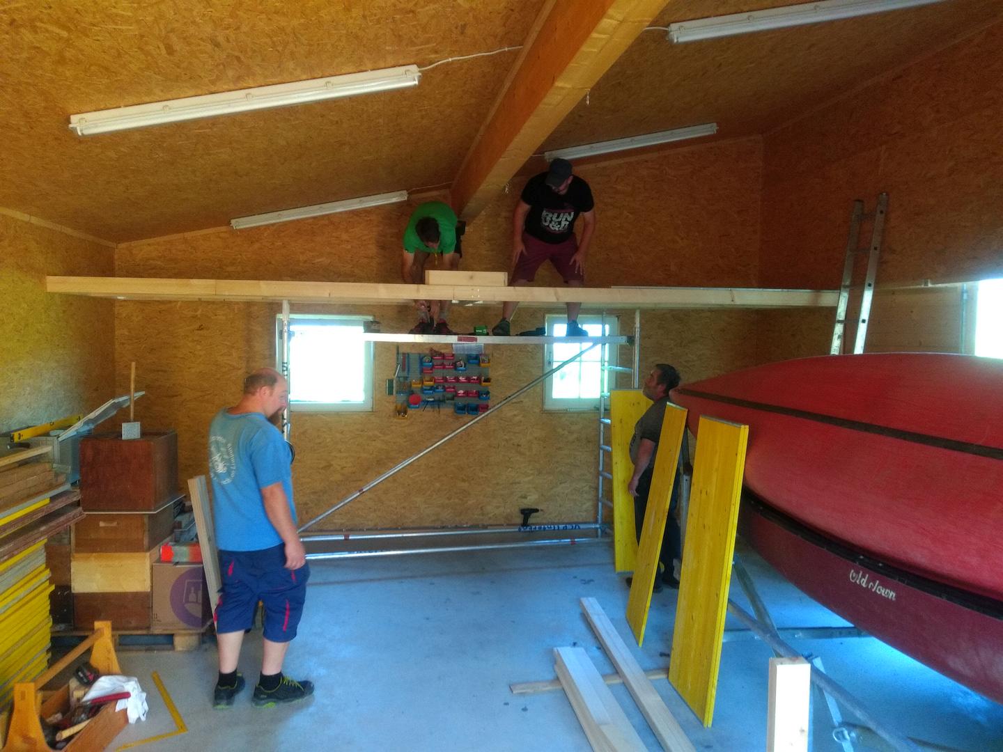Man muss sich schon wundern! Je mehr Platz man hat, desto weniger kann man davon nutzen, weil alles mögliche herumsteht. Heute wurde eine zusätzliche Bühne in die Garage integriert, um Sperriges besser verstauen zu können. Eine Hand voll Helfer setzten die kleine Baumaßnahme gekonnt um und gestalteten die Nutzung der Garage um. Die Werkbänke bekamen gleich vorne am Haupteingang einen neuen Platz und die Boote wurden auf ein fahrbares Lagergestell gepackt. Es hat zwar noch nicht jede Sache seinen neuen Platz gefunden, aber die Weichen für eine besser Garagennutzung sind gestellt. Ordnung halten ist jetzt angesagt!