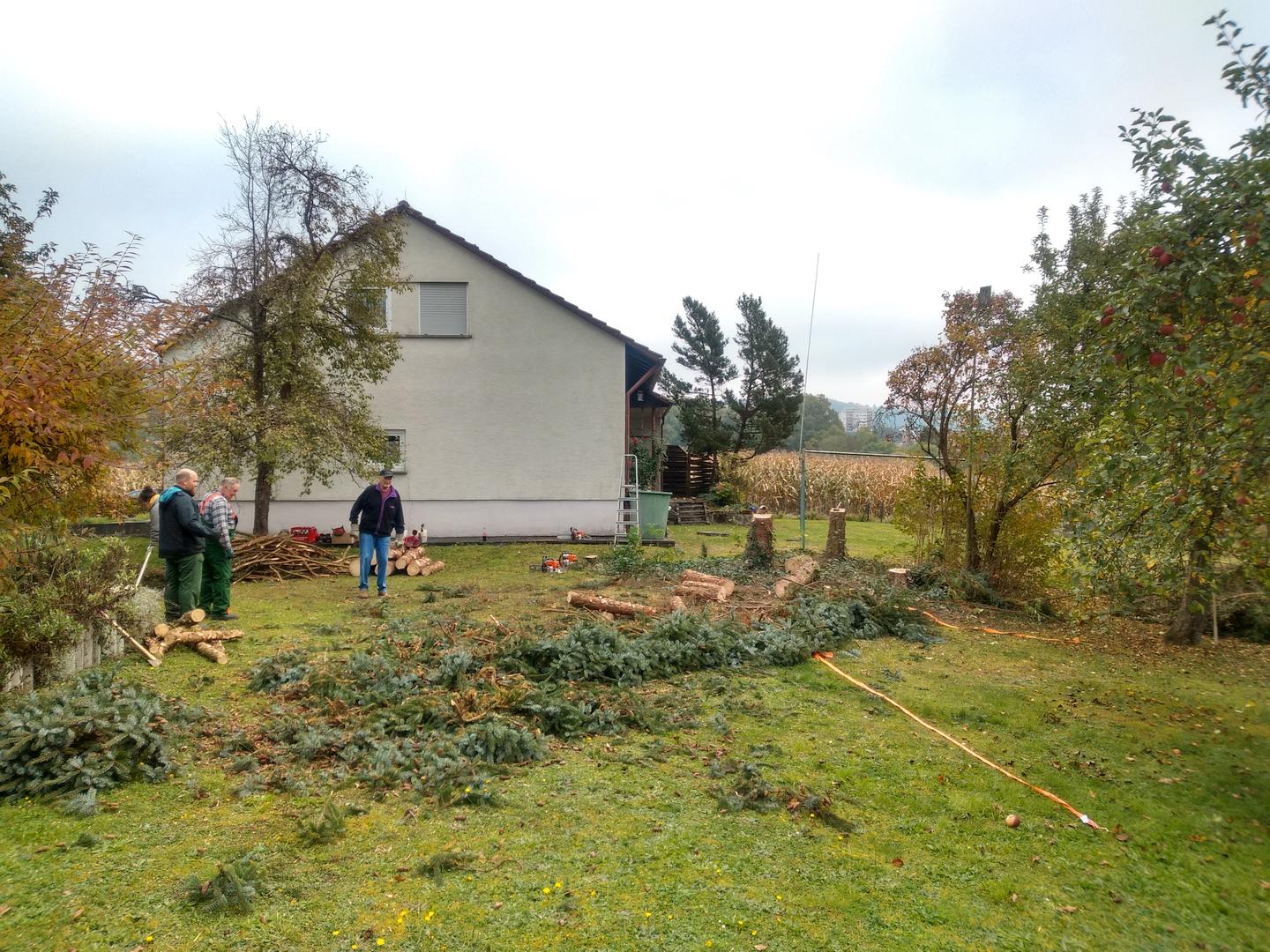 Am Samstag trafen sich früh morgens einige Mitglieder des Fördervereins in Kleinaltdorf, um vier Tannen zu fällen. Von Petra und Lore - den Besitzerinnen - bestens bewirtet machten sich die Helfer an die Arbeit. Die Fällarbeiten waren schnell erledigt, ungleich aufwendiger war das Entasten und Versorgen des Schnittgutes. Aber gegen Mittag war das meiste erledigt und die Arbeit zum größten Teil vollbracht. Das Stammholz wird für das Pfadihaus als Brennholz genutzt. Bekanntlich macht Brennholz mehrmals warm - beim Machen, Lagern und beim Einheizen. An dieser Stelle nochmals vielen Dank an die Helfer und vielen Dank auch an Petra und Lore für die köstliche Bewirtung!