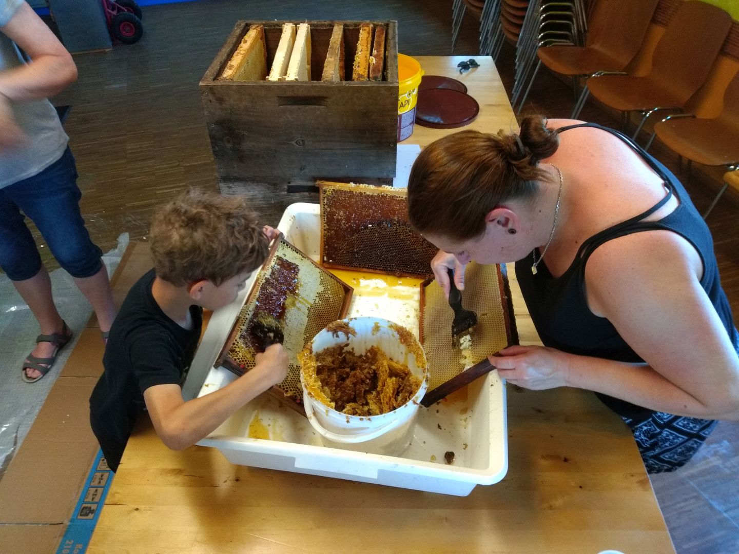 Am letzten Juni-Sonntag war es so weit, der diesjährige Pfadi-Honig wurde im Pfadihaus geschleudert. Da hatten wir einiges zu tun! Denn es gab für unsere Verhältnisse sehr viel Honig. Es kamen über 120 kg Honig zusammen, juhu! Unsere Bienen am Pfadihaus waren sehr fleißig gewesen. Aber ohne die vielen Helferinnen und Helfer hätte es wesentlich länger gedauert, den vielen Honig zu schleudern. Von sechs Bienenvölkern konnten Honigwaben entnommen werden. Da hatte die Imkergruppe des Fördervereins sehr gute Vorarbeit geleistet. Beim Entdeckeln der Waben halfen Groß und Klein voller Tatendrang mit. Unsere Honigschleuder drehte sich stundenlang, bis alle Honigwaben entleert in die Bienenvölker zurückgehängt werden konnten. Um die Helferinnen und Helfer bei Kräften zu halten, gab es Ofenkartoffeln mit Honig-Marinade, sehr lecker! Danach konnte der frisch geschleuderte Honig auf Butterbrot verköstigt werden, lecker lecker lecker. Es waren alle stolz und mit diesem tollen Ergebnis sehr zufrieden. Und das besten daran ist, dass es genug Honig bis zur nächsten Honigernte im kommenden Jahr gibt :)