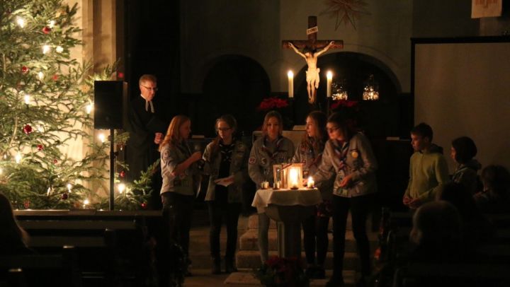 Am Spätgottesdienst an Heiligabend gab es einen großen Gottesdienst mit Herrn Dekan Altenmüller, an diesem sich die Pfadfinder fleißig beteiligt haben. Jeder konnte an diesem Abend das Friedenslicht mit nach Hause nehmen und nach dem Gottesdienst den Abend mit einem leckeren Chai der Pfadfinder ausklingen lassen.